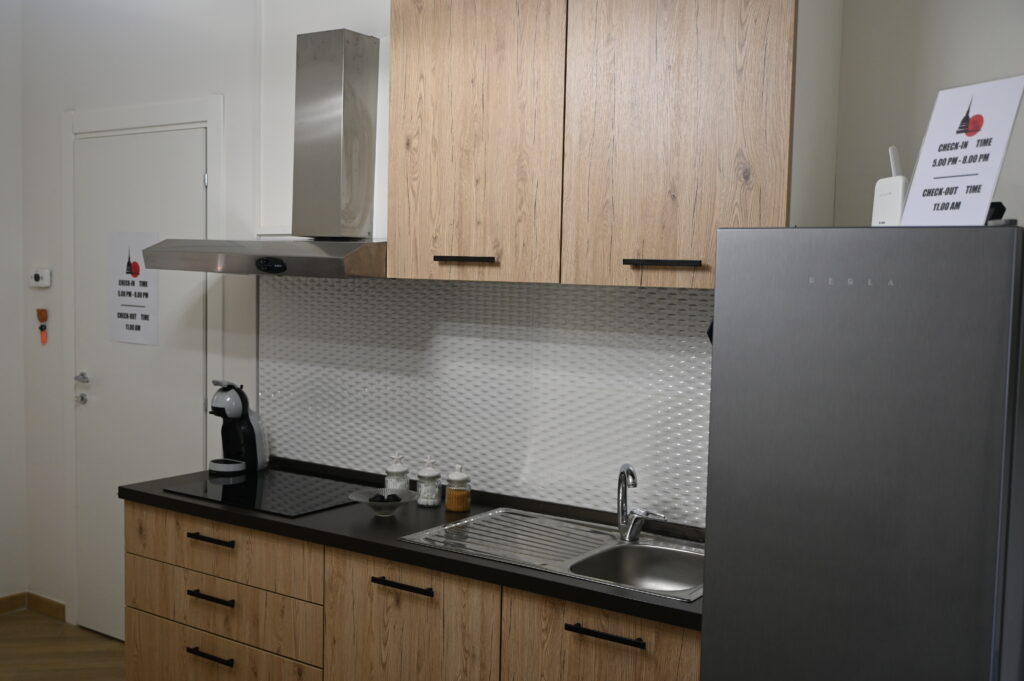 cucina ad induzione attrezzata completa di frigorifero, forno a microonde e macchina per il caffè Nescafè.